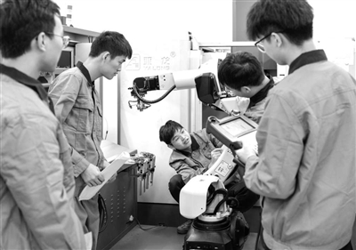 宜賓職業(yè)技術(shù)學(xué)院數(shù)控專業(yè)學(xué)生在調(diào)試工業(yè)機(jī)器人協(xié)助數(shù)控機(jī)床自動上下料。