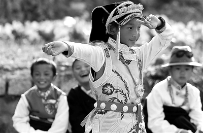勒烏二小戶外藝術(shù)實(shí)踐活動(dòng)在院壩開(kāi)展,一名小學(xué)生在活動(dòng)中載歌載舞。
