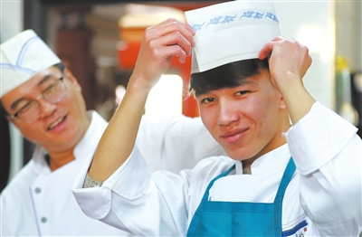 和碩縣高級中學(xué)烹飪專業(yè)學(xué)生艾力·艾山(右)被當(dāng)?shù)匾患抑蛷d錄用,受到餐廳主管的好評。
