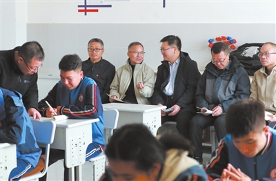 張家口市職業(yè)教育調(diào)研團(tuán)成員深入和碩縣高級中學(xué)隨堂聽課,與評課組專家交流評課意見。