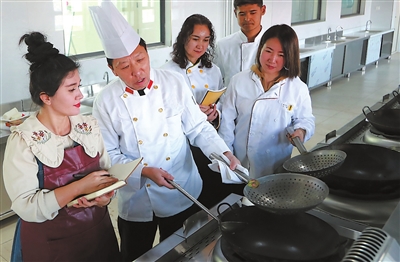 張家口市援疆教師張翠蘭(左)給和碩縣高級(jí)中學(xué)烹飪專業(yè)學(xué)生傳授面點(diǎn)制作方法。