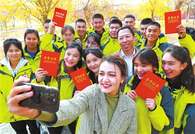 新疆和碩縣高級(jí)中學(xué)教師熱洋古麗,用手機(jī)和在當(dāng)?shù)嘏腼冃袠I(yè)技能大賽中斬獲多項(xiàng)榮譽(yù)的師生一起記錄獲獎(jiǎng)后的幸福時(shí)刻。