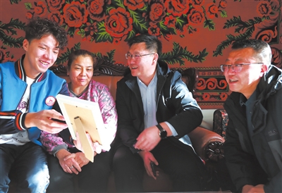 張家口市職業(yè)技術(shù)教育中心黨委書記秦占軍(右二)走進(jìn)和碩縣高級(jí)中學(xué)烹飪專業(yè)學(xué)生艾力亞爾·買買提明家中,艾力亞爾拿出自己在張家口學(xué)習(xí)時(shí)的照片,與老師們一起回憶美好時(shí)光。