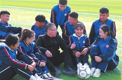 和碩縣高級(jí)中學(xué)副校長、張家口市職業(yè)技術(shù)教育中心援疆教師陳文斌(前排中)與學(xué)生們愉快交談。
