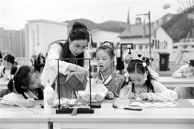 浙江省磐安縣大盤小學(xué)教師付小蘭正在進(jìn)行針刺無骨花燈非遺特色課展示。資料圖片