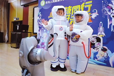②山東省青島人民路第二小學(xué)兩名身穿“宇航服”的學(xué)生與仿生機器狗互動。王海濱 攝
