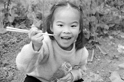 幼兒興奮地夾起小蟲子。幼兒園供圖