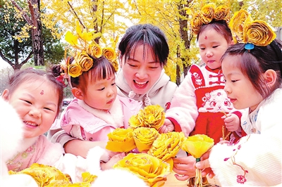日前,浙江省湖州市長興縣水木花都幼兒園的教師和孩子們一起在銀杏大道上撿拾銀杏葉,設(shè)計制作出了一朵朵個性十足的銀杏葉簪花?;顒又校⒆觽冇H近大自然,鍛煉動手能力,發(fā)揮想象力和創(chuàng)造力。圖為教師和孩子們共同欣賞簪花作品。 通訊員 譚云俸 尹鍶 攝