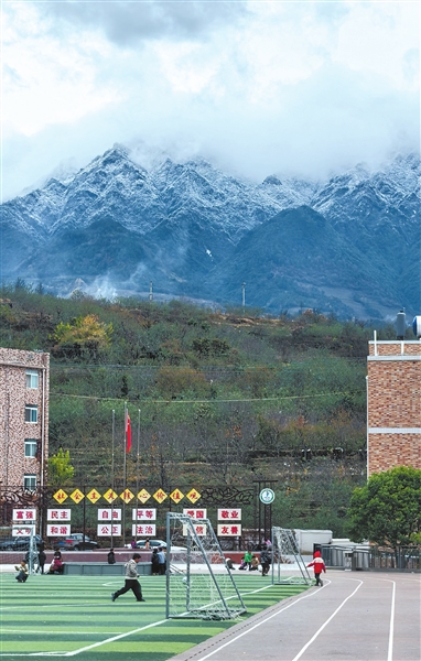 2024年12月底,宜東鎮(zhèn)中心小學的同學們在雪山下的校園踢球。 本報記者 葛仁鑫 攝