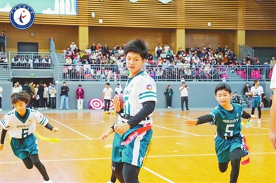 鄭州市經(jīng)開區(qū)朝鳳路小學(xué)的學(xué)生在進(jìn)行腰旗橄欖球展示。 張信合 攝