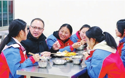 來(lái)自四川省成都市樹(shù)德中學(xué)的幫扶教師許國(guó)華在陪餐時(shí)與丹巴高級(jí)中學(xué)學(xué)生親切交談。