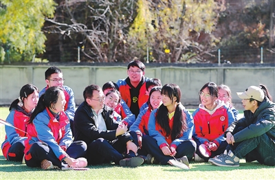 冬日暖陽(yáng)下,來(lái)自四川省成都市第四十九中學(xué)校的政治教師彭建中(左四)和來(lái)自四川省資中縣第三中學(xué)的地理教師孫東斌(右一)與丹巴高級(jí)中學(xué)學(xué)生交流。