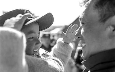在定日縣長(zhǎng)所鄉(xiāng)嘎布村,一個(gè)孩子戴上警察米瑪次仁的帽子敬禮(1月14日攝)。