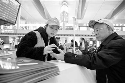 小圖:在重慶西站紅巖服務(wù)站,大學(xué)生志愿者耐心解答乘客問題。
