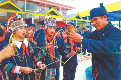 在長期的實踐摸索和專家的指導下,學校決定從增強學生對傳統(tǒng)文化的認同上打開突破口。教師們一起去找寨子里傳承手工藝的老人聊天、學習,盡可能地把傳統(tǒng)習俗和文化融入音樂、美術(shù)、體育教學。“孩子們認識到了傳統(tǒng)文化的優(yōu)勢和價值,自信心就起來了?!崩疃氛f。