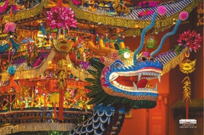 那些活躍在春節(jié)期間的非遺民俗更是絢麗多姿,好像鉚足了勁兒,要在“春晚大舞臺”上大顯身手。臘月迎新的京西太平鼓、立春勸耕的內(nèi)鄉(xiāng)打春牛、引人駐足觀看的高密撲灰年畫、令人拍手叫好的滄縣獅舞……特別是展廳正中央的“樂清首飾龍”,龍船造型的燈彩集木工、油彩、紙?jiān)垷簟⒖碳埖裙に囉谝惑w。遠(yuǎn)觀,巨龍昂首挺胸,樓船富麗堂皇;近看,不僅有雕梁畫棟,船上百十號人物更是姿態(tài)各異、栩栩如生。