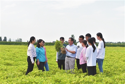 ③國家科技進步獎二等獎獲得者、山東農業(yè)大學花生育種專家萬勇善教授在田間與團隊成員查看花生新品種生長狀況。學校供圖