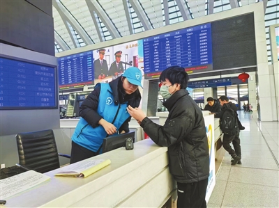 天津鐵道職業(yè)技術(shù)學(xué)院大學(xué)生志愿者在天津西站為旅客答疑解惑。學(xué)校供圖