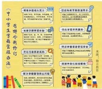 《辦法》做了六個(gè)方面的修訂。一是明確了學(xué)籍、學(xué)籍信息、學(xué)籍管理、學(xué)籍檔案的定義,對學(xué)籍信息、學(xué)籍管理、學(xué)籍檔案明確地作出了類型劃分。二是進(jìn)一步明確了國家、省、市、縣、校各級學(xué)籍管理部門的權(quán)力、職責(zé),對學(xué)籍管理權(quán)進(jìn)行合理調(diào)整,賦予地方學(xué)籍管理部門相應(yīng)的自主管理權(quán)。三是優(yōu)化信息系統(tǒng)架構(gòu),明確國家學(xué)籍系統(tǒng)采用一級部署、五級應(yīng)用模式,并對國家學(xué)籍系統(tǒng)與地方學(xué)籍系統(tǒng)職能進(jìn)行了合理定位與區(qū)分。四是解決學(xué)籍管理突出問題,突出了教育公平,對跨省轉(zhuǎn)學(xué)、省內(nèi)轉(zhuǎn)學(xué)等學(xué)籍變動條件進(jìn)一步作了細(xì)化規(guī)范。五是回應(yīng)特殊學(xué)籍管理需求,對特殊教育學(xué)生、專門學(xué)校學(xué)生、境外學(xué)生、高中階段職普融通項(xiàng)目學(xué)生等類型的學(xué)籍管理作出規(guī)定,為推進(jìn)基礎(chǔ)教育相關(guān)改革提供支撐。六是優(yōu)化學(xué)籍應(yīng)用服務(wù)和人文關(guān)懷,對學(xué)生教育數(shù)字身份、學(xué)籍管理移動端建設(shè)、減證便民等作出明確規(guī)定。