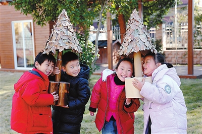 近日,浙江省諸暨市暨南街道街亭幼兒園的孩子們,利用落葉、硬卡紙、固體膠、棍子等材料制作了一棵棵富有大自然氣息的“小樹”。通過活動(dòng),孩子們不僅學(xué)會(huì)了合理利用廢舊物品,更鍛煉了動(dòng)手能力。圖為孩子們把用落葉做成的“小樹”當(dāng)“雨傘”玩。 陳霞芳 攝