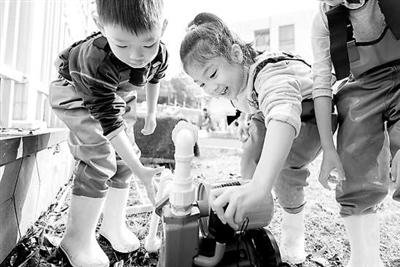 智慧緣起:水是生命之源,節(jié)約用水,應(yīng)該從小做起。當(dāng)前,節(jié)水已經(jīng)成為全社會(huì)的共識(shí)。在努力踐行這一做法的同時(shí),我們總會(huì)發(fā)現(xiàn),幼兒園里的沙池、水池,這些深受孩子們喜愛(ài)的游戲場(chǎng),不可避免地存在著大量的水流失現(xiàn)象。沙與水是對(duì)孩子們非常具有吸引力的“玩具”,我們通過(guò)與孩子們對(duì)話、與家長(zhǎng)對(duì)話、與設(shè)施設(shè)備工作人員對(duì)話,以幼兒園假期改建為契機(jī),開(kāi)展了幼兒園里的“水循環(huán)”這一節(jié)水活動(dòng)。