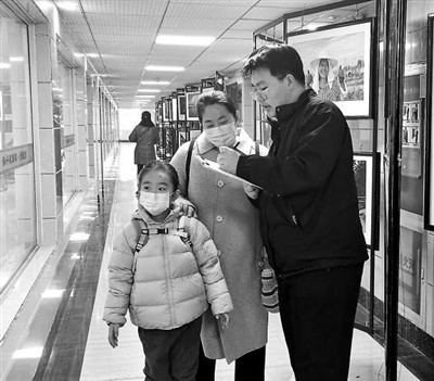 圖②中國(guó)地質(zhì)大學(xué)(武漢)志愿者為家長(zhǎng)講解“愛心托管”示范班課程安排。
