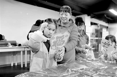 “把4個(gè)角按緊,再蘸點(diǎn)顏料,把空隙都填滿……”王蓉麗奶奶用不太流利的普通話,耐心地指導(dǎo)著孩子們進(jìn)行手工活動(dòng)——扇面拓印。福字、窗花……在奶奶們的悉心指導(dǎo)下,孩子們制作的一幅幅精美扇面作品逐漸成形。