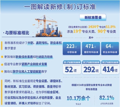 新標(biāo)準(zhǔn)覆蓋《職業(yè)教育專業(yè)目錄》1434個(gè)專業(yè)的52.9%,涉及19個(gè)專業(yè)大類(lèi)、90個(gè)專業(yè)類(lèi)。其中,中職標(biāo)準(zhǔn)223項(xiàng),高職??茦?biāo)準(zhǔn)471項(xiàng),職業(yè)本科標(biāo)準(zhǔn)64項(xiàng);第一產(chǎn)業(yè)相關(guān)專業(yè)標(biāo)準(zhǔn)52項(xiàng),第二產(chǎn)業(yè)相關(guān)專業(yè)標(biāo)準(zhǔn)292項(xiàng),第三產(chǎn)業(yè)相關(guān)專業(yè)標(biāo)準(zhǔn)414項(xiàng)。根據(jù)2024年全國(guó)職業(yè)教育專業(yè)布點(diǎn)數(shù)據(jù),新標(biāo)準(zhǔn)覆蓋10.1萬(wàn)余個(gè)專業(yè)點(diǎn),占專業(yè)布點(diǎn)總數(shù)的82.1%。