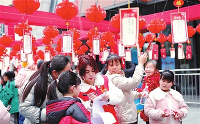 2月11日,在重慶永川青少年宮趣味游戲區(qū),家人帶著孩子在猜燈謎。當(dāng)日,共青團(tuán)重慶市永川區(qū)委、重慶市永川區(qū)少工委舉辦“福蛇元宵,年味非遺”元宵游園會(huì),設(shè)置非遺項(xiàng)目體驗(yàn)區(qū)和趣味游戲區(qū),讓孩子們和家長在這里樂迎元宵節(jié)。