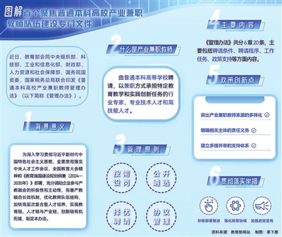 本報北京2月20日訊(記者 張欣)為充分調(diào)動企業(yè)參與產(chǎn)教融合的積極性和主動性,優(yōu)化教師隊伍結(jié)構(gòu),推進高校人才培養(yǎng)與工程實踐、科技創(chuàng)新有機結(jié)合,近日,教育部會同中央組織部、科技部、工業(yè)和信息化部、財政部、人力資源和社會保障部、國務(wù)院國資委、國家稅務(wù)總局聯(lián)合印發(fā)《普通本科高校產(chǎn)業(yè)兼職教師管理辦法》(以下簡稱《管理辦法》)?!豆芾磙k法》分為總則、聘請條件、聘請程序、工作任務(wù)、政策支持、附則6章20條,是首個聚焦普通本科高校產(chǎn)業(yè)兼職教師隊伍建設(shè)出臺的專門文件。