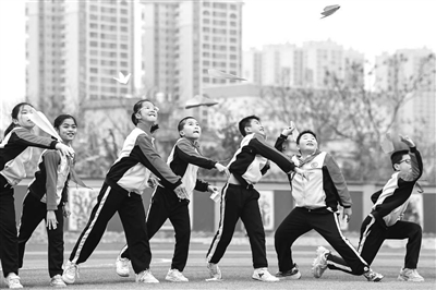 2月18日,在廣西興業(yè)縣第三實驗小學,學生們在體育課上投擲紙飛機。