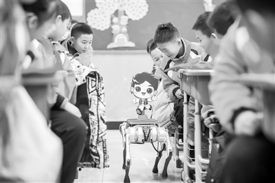 新疆昌吉市第一小學(xué)學(xué)生重返校園,在課余觀看仿生機器狗表演。 通訊員 楊斌 攝