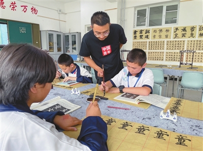 ③新疆生產(chǎn)建設(shè)兵團第三師五十一團第一中學(xué)的書法教師在指導(dǎo)學(xué)生學(xué)書法。蔣夫爾 攝