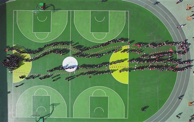 2月26日,河北省石家莊市草場街小學(xué)學(xué)生在觀賞龍頭蜈蚣風(fēng)箏(無人機(jī)照片)?!岸露迸R近,當(dāng)?shù)刂行W(xué)邀請風(fēng)箏制作民間藝人作為校外輔導(dǎo)員,介紹風(fēng)箏文化和制作技藝,讓學(xué)生感受傳統(tǒng)文化魅力。 新華社發(fā)