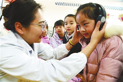 在全國愛耳日到來之際,江蘇省鎮(zhèn)江市蔣喬社區(qū)衛(wèi)生服務(wù)中心醫(yī)務(wù)人員在童蕾藍天幼兒園指導小朋友正確使用耳機。當日,該服務(wù)中心醫(yī)務(wù)人員來到童蕾藍天幼兒園,開展“愛耳護耳 從小做起”活動,引導小朋友從小養(yǎng)成愛耳護耳習慣。石玉成 攝