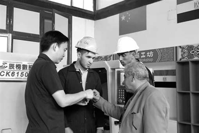 ③ 數(shù)控專業(yè)教師在埃及開(kāi)羅高級(jí)維修技術(shù)學(xué)校魯班工坊指導(dǎo)學(xué)生進(jìn)行零部件數(shù)控加工。學(xué)校供圖