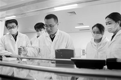 山東理工大學(xué)與金城醫(yī)藥集團共建合成生物學(xué)與工程生物技術(shù)研究院,馬欽元教授(左三)指導(dǎo)研發(fā)人員開展分子實驗。山東理工大學(xué)供圖(資料圖片)