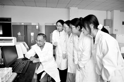 全國高校黃大年式教師團隊——青海大學(xué)三江源生態(tài)演變與環(huán)境修復(fù)教師團隊負責人李希來教授(左一)指導(dǎo)學(xué)生做實驗。青海大學(xué)供圖(資料圖片)