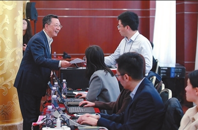 ?、俳逃鐒e小組會議,全國政協(xié)委員姜耀東(左)將他的發(fā)言記錄校對后,交還給工作人員。