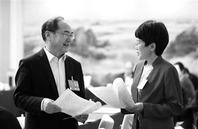 3月10日,全國人大代表、山東省臨沂市北城小學(xué)黨總支書記張淑琴(右)與全國人大代表、臨沂大學(xué)食品研究院院長王學(xué)斌交流。 本報記者 張學(xué)軍 攝