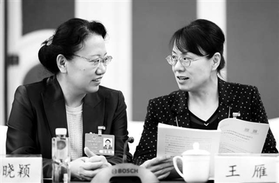 3月10日,全國人大代表、山東省棗莊市第三中學(xué)教師孫曉穎(左)與全國人大代表、煙臺市樹德技工學(xué)校副校長王雁一起交流討論。 本報記者 張學(xué)軍 攝