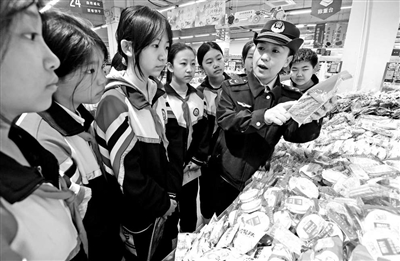 3月14日,河北省邯鄲市邯山區(qū)市場監(jiān)督管理局的工作人員為邯山區(qū)開元小學(xué)的學(xué)生講解辨識(shí)安全食品的方法。該校開展“消費(fèi)權(quán)益我守護(hù)”主題教育活動(dòng),學(xué)生們?cè)诠ぷ魅藛T的帶領(lǐng)下來到超市學(xué)習(xí)日常消費(fèi)維權(quán)知識(shí),遠(yuǎn)離“三無”產(chǎn)品,爭當(dāng)維權(quán)小衛(wèi)士,迎接“3·15”國際消費(fèi)者權(quán)益日的到來。