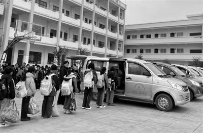 每周五下午,接學生回家的農(nóng)村客運車輛停放在學校操場指定位置。教師有序組織寄宿制學生到各村指定位置等待,班主任、值日教師配合客運司機清點人數(shù)及監(jiān)管學生安全,引導學生有序排隊坐車,直至學生全部離校。