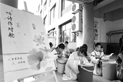 浙江省衢州市實(shí)驗(yàn)學(xué)校教育集團(tuán)靈溪校區(qū)的學(xué)生在“童年詩光機(jī)”活動中興致盎然地吟詩作對。黃紫依 攝