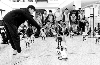 ①在江蘇大學(xué)第四屆計(jì)算機(jī)文化節(jié)上,大學(xué)生帶著該校附屬學(xué)校的小學(xué)生觀賞智能機(jī)器人表演。