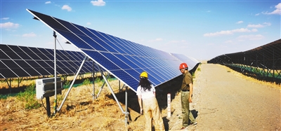 蘭州大學(xué)土木工程與力學(xué)學(xué)院黃寧教授團(tuán)隊(duì)和三峽集團(tuán)技術(shù)人員在查看建在沙漠里的光伏電站光伏板下被風(fēng)掏蝕的地表,并研究如何解決該問題。學(xué)校供圖