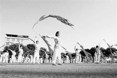 在湖南省永州市新田縣龍泉四小運動場,學(xué)生們在嫻熟地舞動民間傳統(tǒng)運動項目彩帶龍。劉貴雄 鄭軍 攝