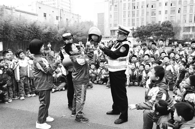 ①陜西省渭南市公安局交警支隊(duì)臨渭大隊(duì)民警為學(xué)生們講解安全頭盔的重要作用。