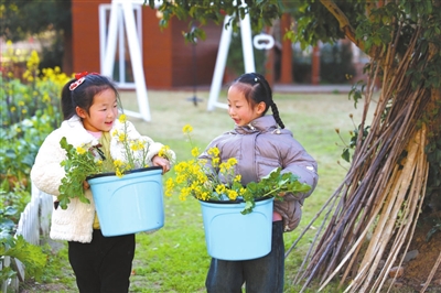 日前,浙江省諸暨市暨南街道街亭幼兒園的孩子們來到種植園地,在教師的指導(dǎo)下觀察青菜花、采摘蘿卜,體驗勞作的樂趣和艱辛。圖為孩子們喜悅地捧著勞動果實。