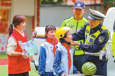 3月27日,在福建省福州市鼓樓區(qū)斗南小學(xué),交警指導(dǎo)學(xué)生正確佩戴安全頭盔。謝貴明 攝